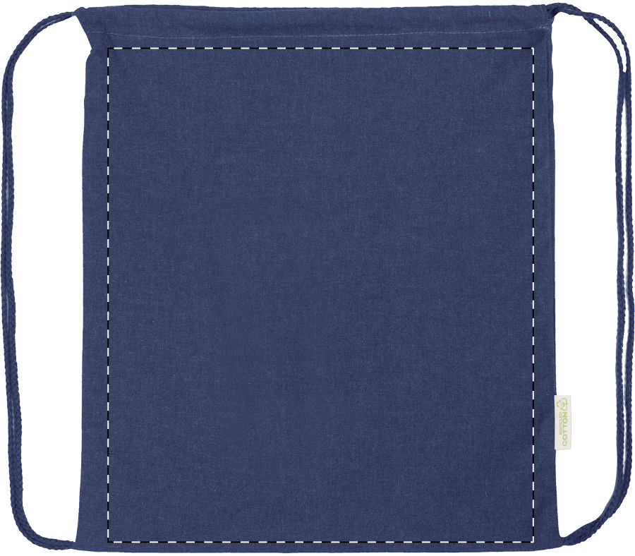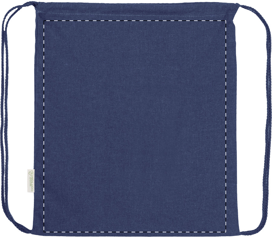 Kordelzugbeutel aus 70 % recycelter Baumwolle und 30 % RPET-Polyester, 140 g/m². Mit Label recycelte Baumwolle.