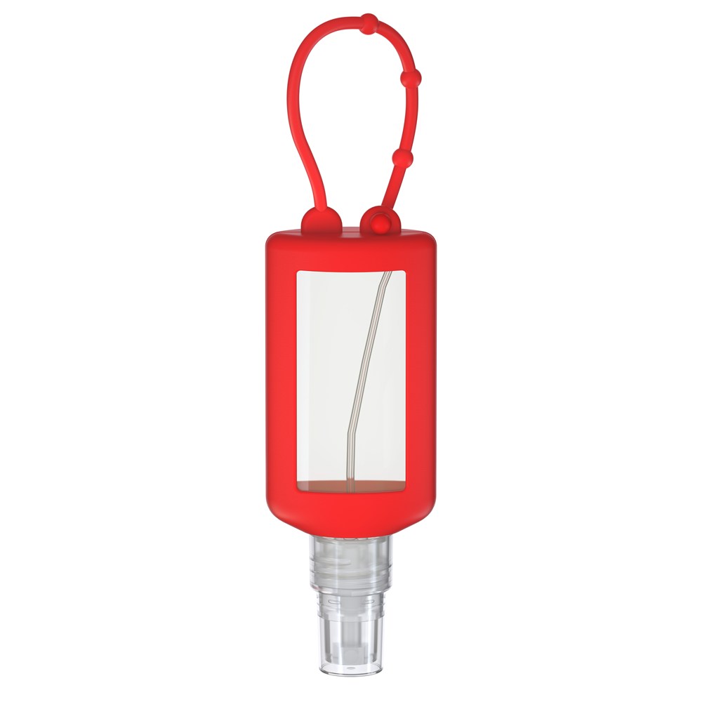 50 ml Flasche aus 100% recyceltem PET, transparent mit leichter R-PET-Färbung mit Pumpaufsatz "transparent" mit Schutzkappe; Silikonhülle und Schlaufe in rot. Nachfüllbar.